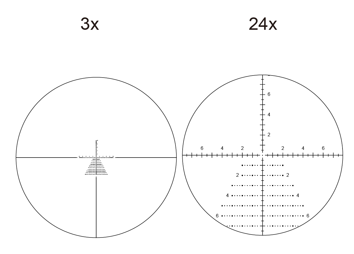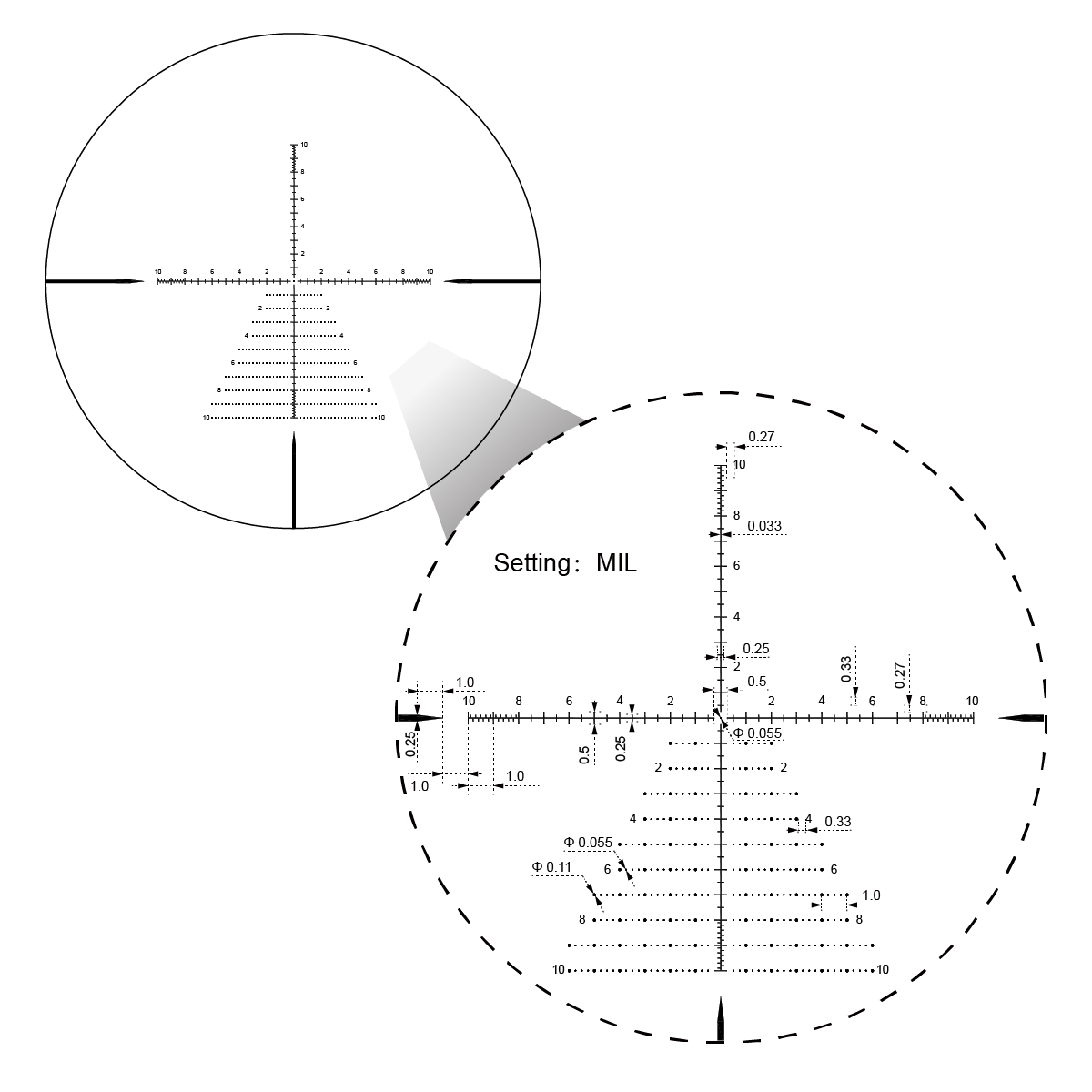 • 1/10 MIL Adjustments with Audible Clicks, 100 Click Per Round, Focus Min from 10 Yards
