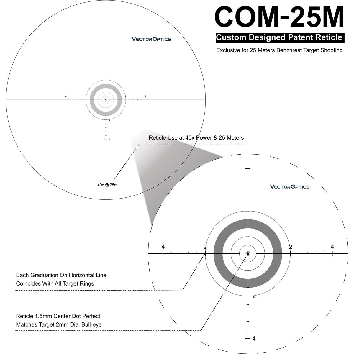 · Custom Designed COM-25M Reticle Exclusive for 25 Meters Benchrest Target Shooting.